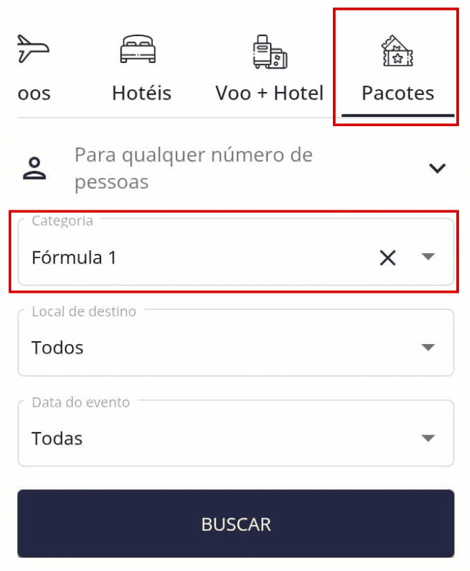 No filtro de "categoria" selecione a opção "Fórmula 1", marque as outras opções e faça a busca.